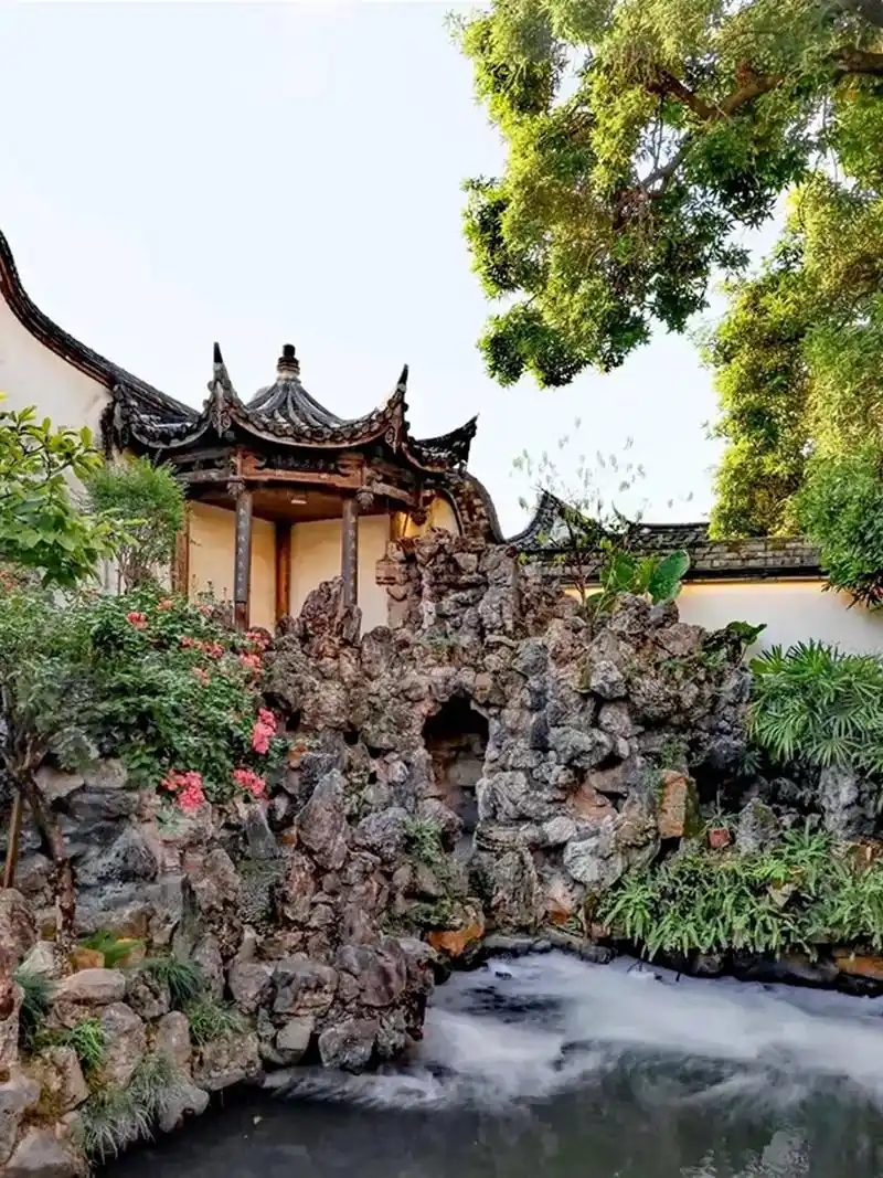 双层楼阁,面阔三间,二楼走廊的露台连接着南面的假山,假山由太湖石对垒而成,鱼池上有一小石拱桥横跨其上,桥栏板上刻着“知鱼乐处”四字,有一番江南园林的味道。