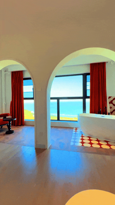 拱门如同一扇通往海底秘境的魔法门,将无垠海景与梦幻空间完美衔接,摊在床上看大海,不出门就好像能沉浸式感受到咸湿海风裹挟着海浪的私语扑面而来~